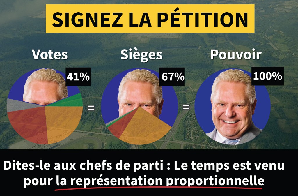 Le système uninominal à un tour de l'Ontario donne tout le pouvoir à un seul parti avec seulement 40 % des voix. La majorité des électrices et des électeurs n'est pas représentée et n'a pas accès aux décisions qui affectent leur vie.